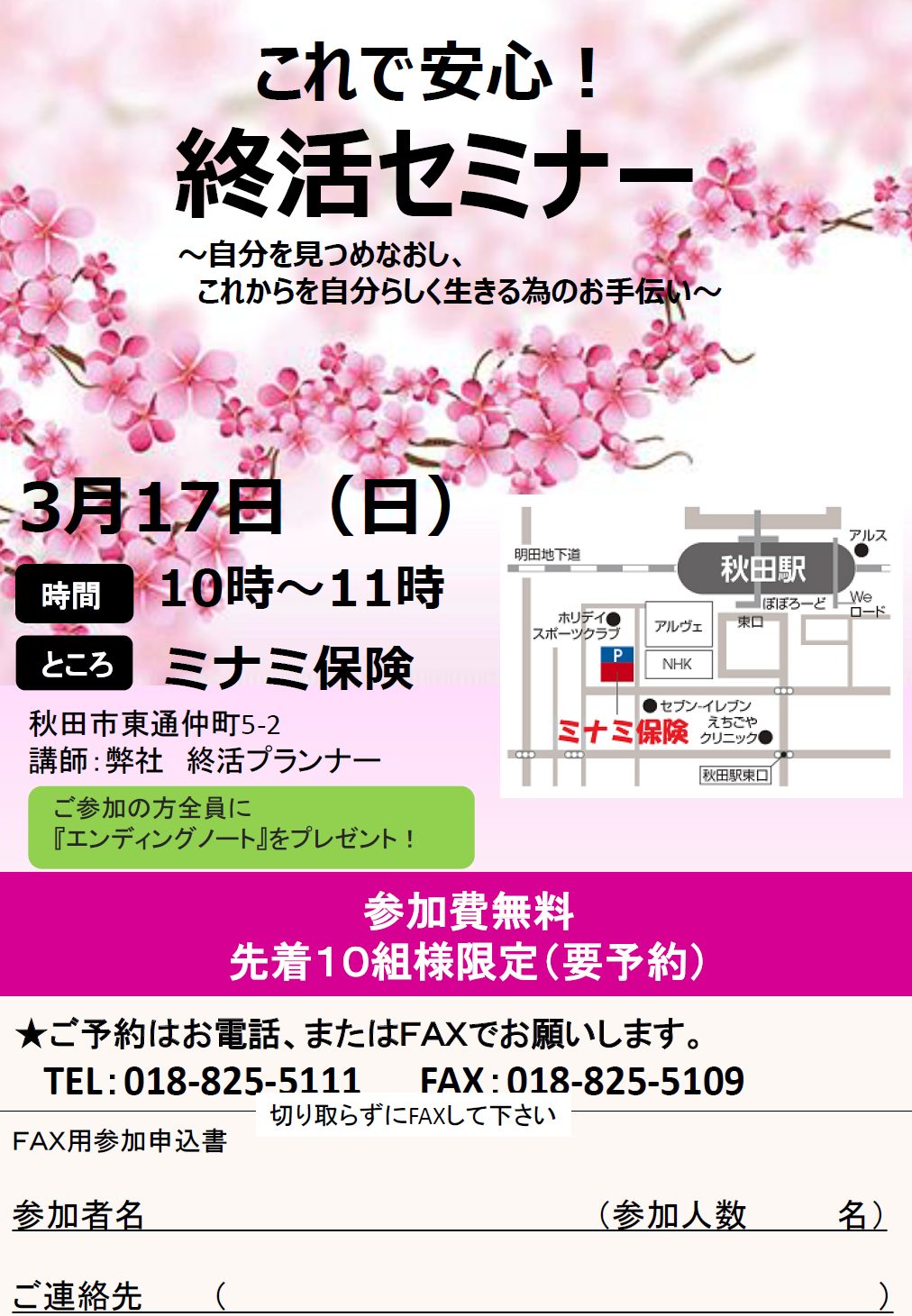 場 所:秋田店 日 時:3月17日(日) 10:00~ 内 容:これで安心!終活セミナー ~自分を見つめなおし、これからを自分らしく生きる為のお手伝い~ 参加費:無料 定 員:10組限定